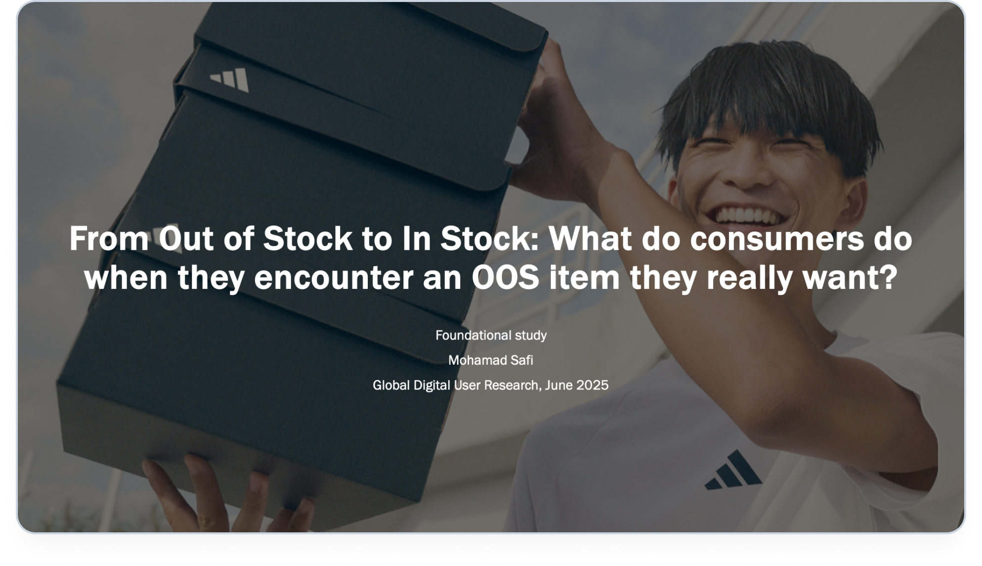 A strategic, foundational research initiative to understand consumer behavior around out-of-stock products, followed up with concept testing on the adidas Product Detail Page (PDP).